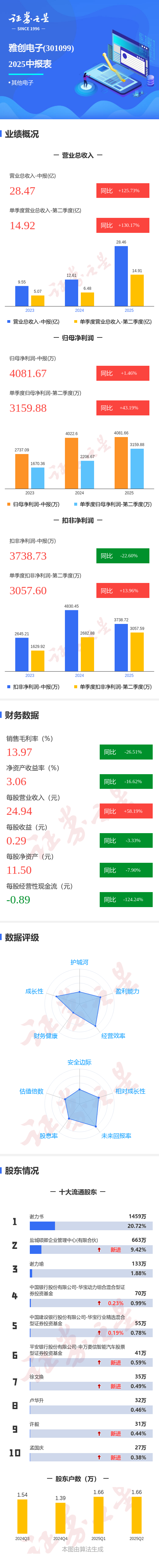 证券之星消息,雅创电子(维权)2025年中报显示,公司主营收入28.47亿元,同比上升125.74%;归母净利润4081.67万元,同比上升1.47%;扣非净利润3738.73万元,同比下降22.6%;其中2025年第二季度,公司单季度主营收入14.92亿元,同比上升130.18%;单季度归母净利润3159.88万元,同比上升43.2%;单季度扣非净利润3057.6万元,同比上升13.97%;负债率62.26%,投资收益22.22万元,财务费用5376.12万元,毛利率13.97%。